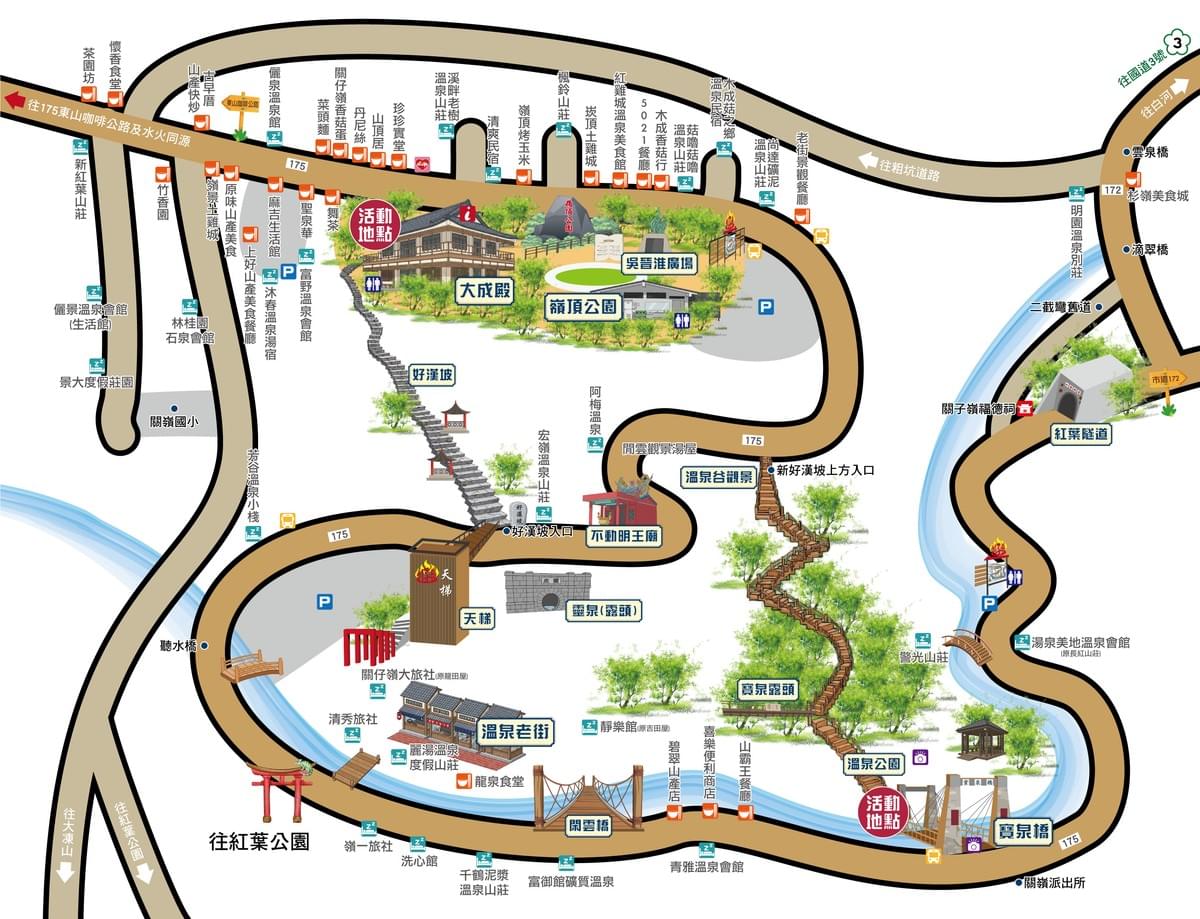 現今溫泉公園內設置木棧道可通往好漢坡,也可通往靜樂館前的閑雲橋,在夜間沿著木棧道邊的樹林及溪邊都有著亮麗的燈飾,為夜間的景觀增色不少,也讓溫泉鄉感覺更為浪漫,泡湯之後悠閒散步於其中是一大享受。湯泉美地溫泉會館(長紅山莊)